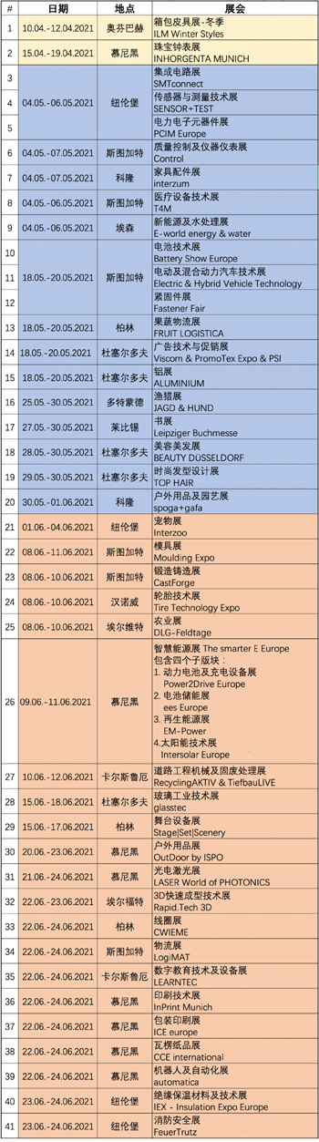 德国封城将暂定至2021年2月14日,并且很大可能继续延长。截止目前,2021年上半年德国还剩下45场展会,一季度展会已经全部取消。随着开展日期的临近,二季度陆续还会有一些展会取消。上周共有8场2021年德国展会发生变化: